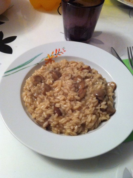 Aggiungere man mano il brodo vegetale. In una padella a parte far andare i funghi con un filo d’olio, sale, pepe (se volete uno spicchio d’aglio) e un pò di brodo vegetale.